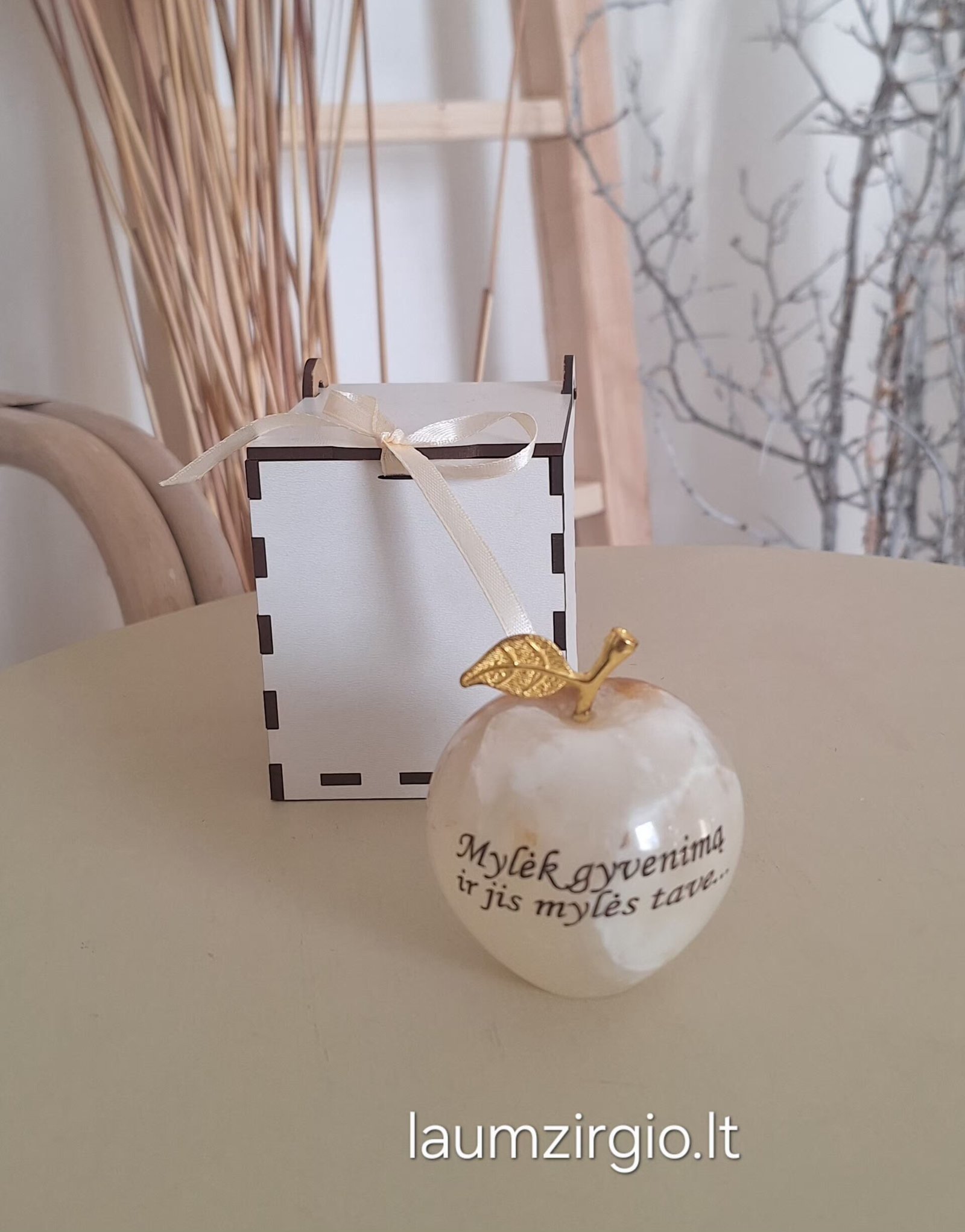 Graviruotas onikso akmens obuolys, tai nuoširdi dovana įvairioms progoms.