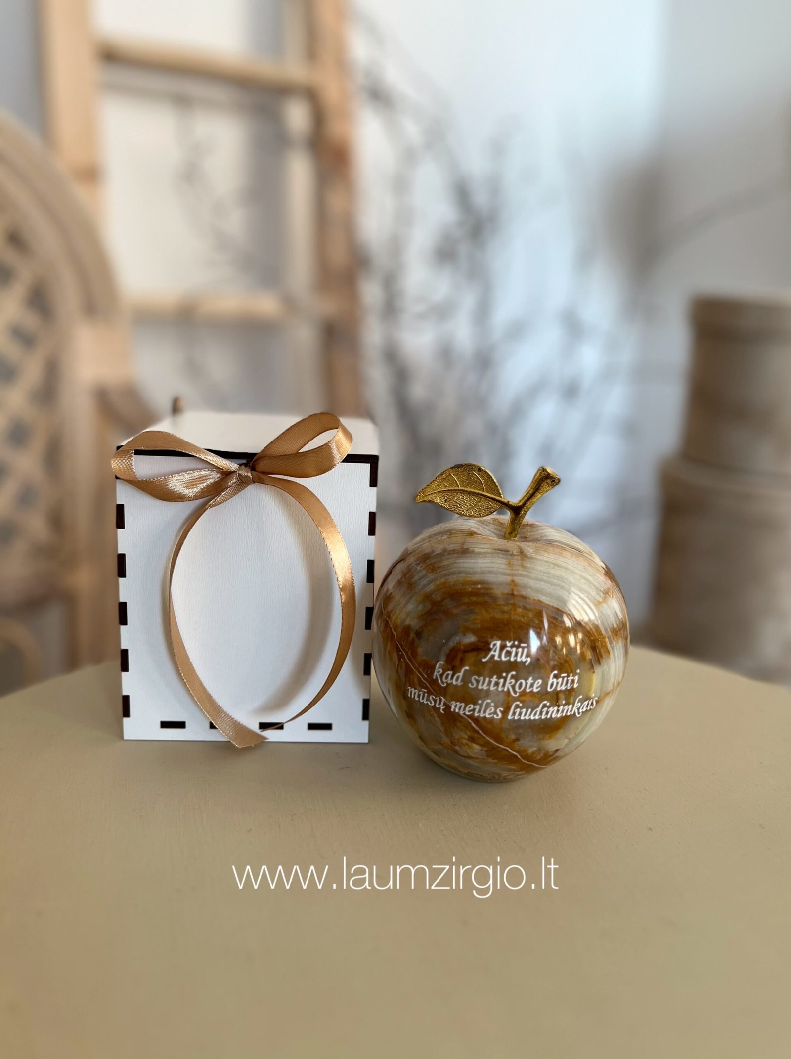 Graviruotas onikso akmens obuolys, tai nuoširdi dovana įvairioms progoms.