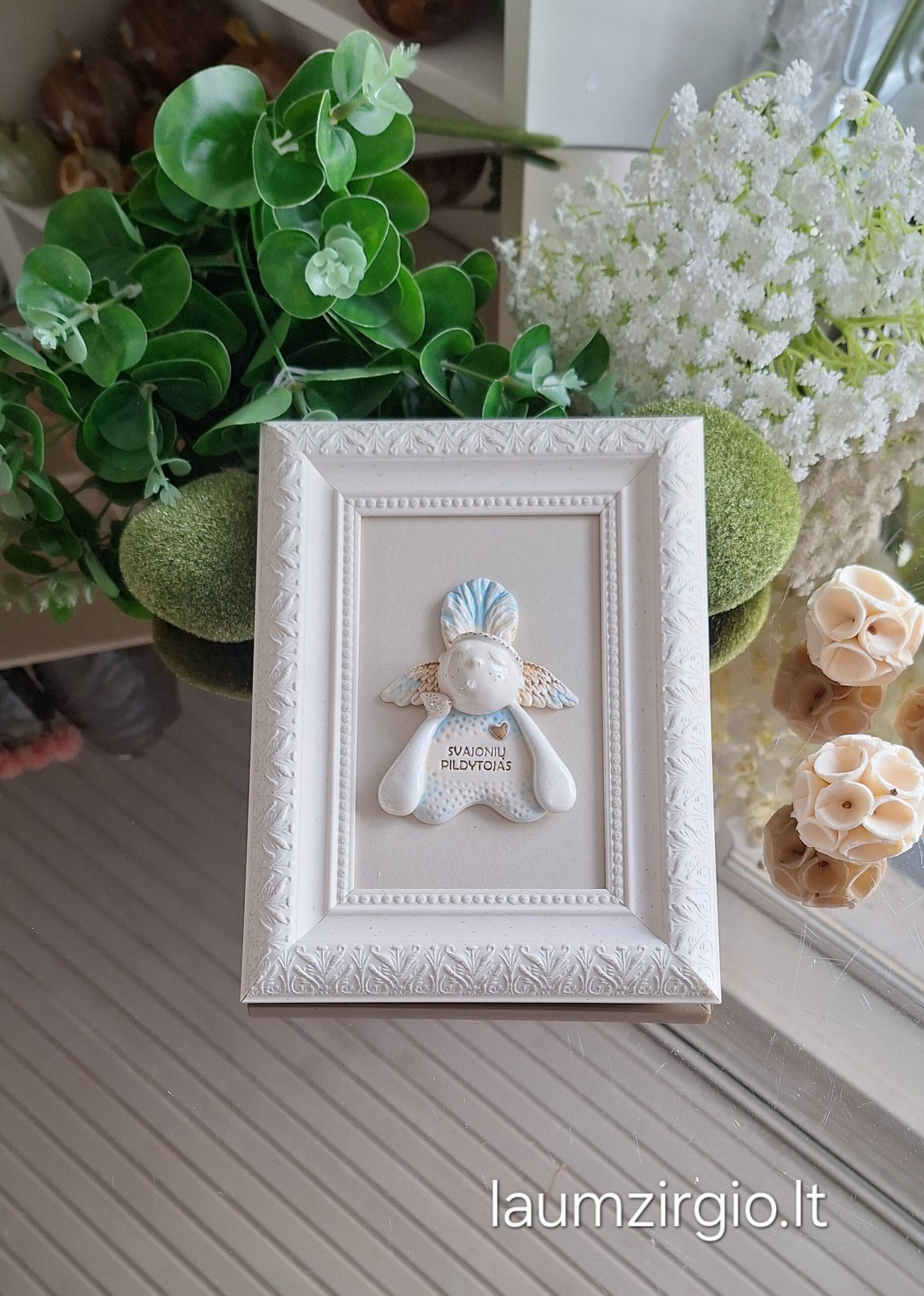 Autorinis Laumžirgio namų rankų darbo keraminis angelas rėmelyje.