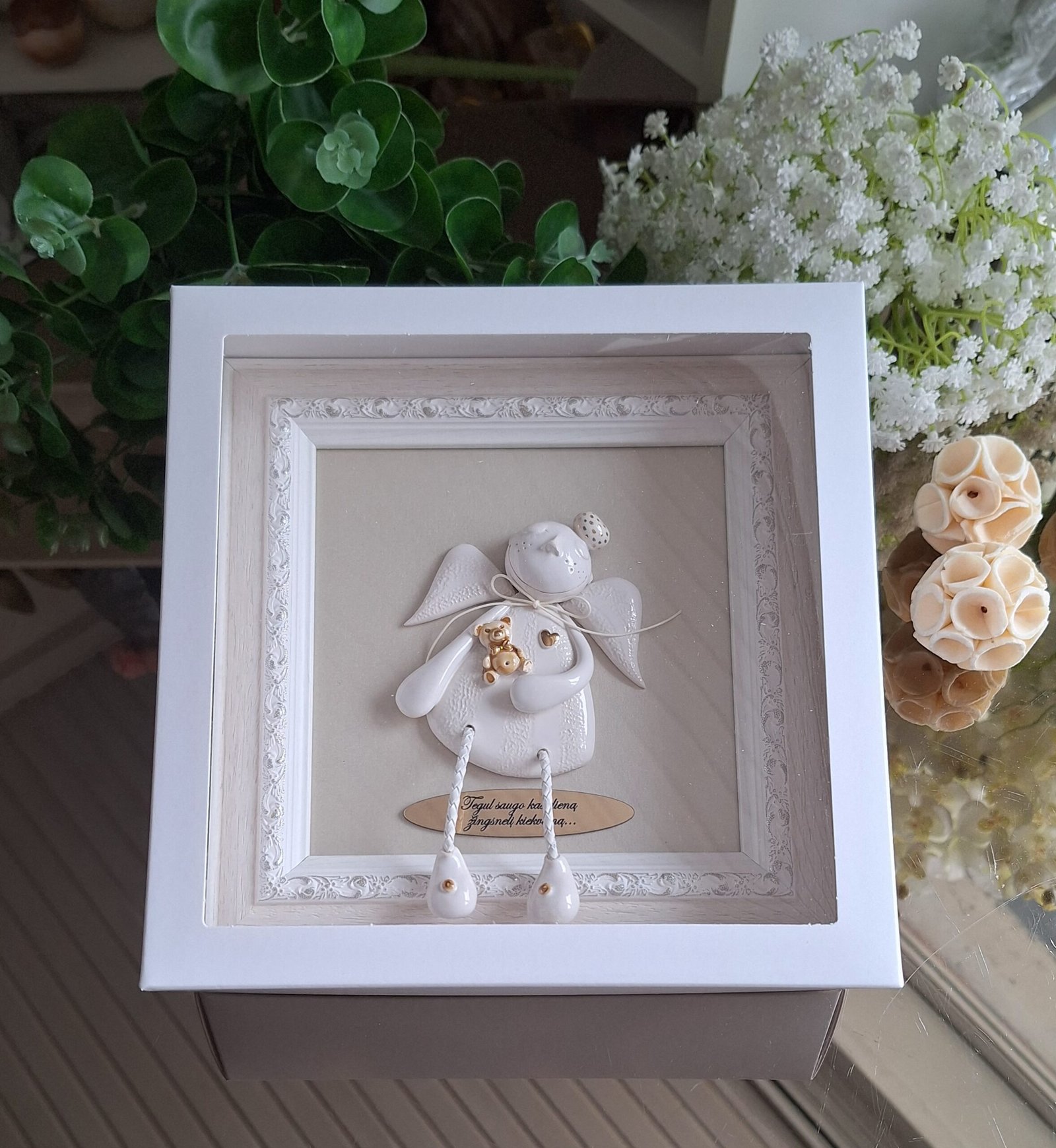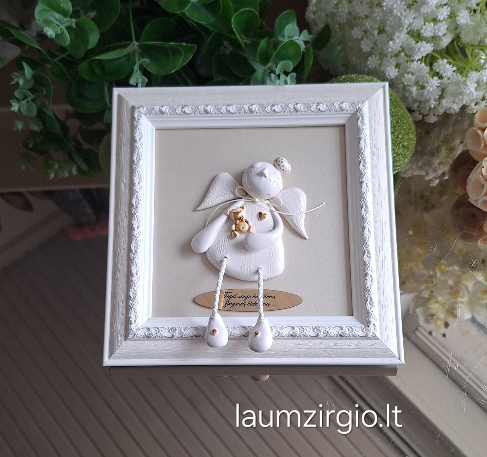 Autorinis Laumžirgio namų rankų darbo keraminis angelas rėmelyje.