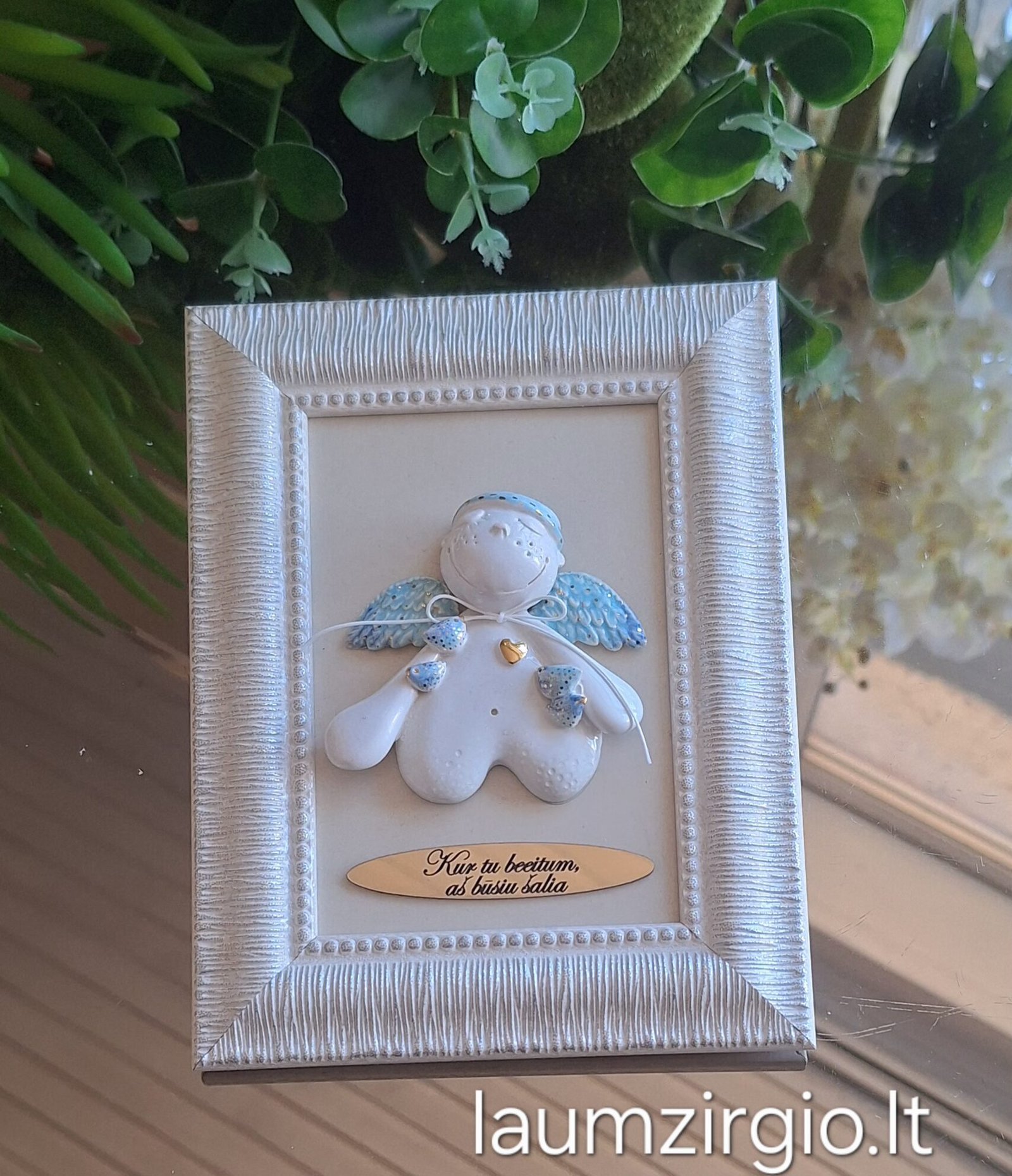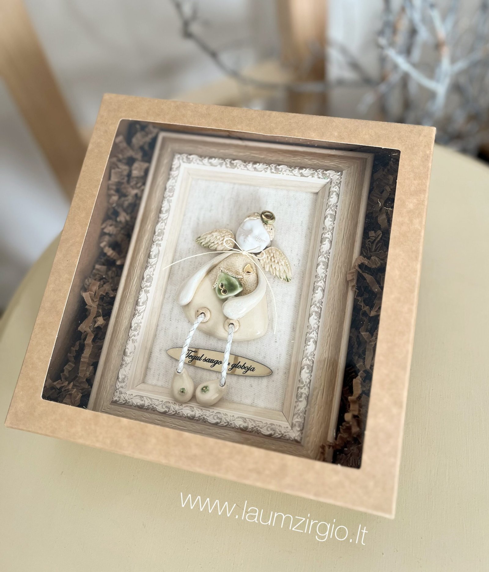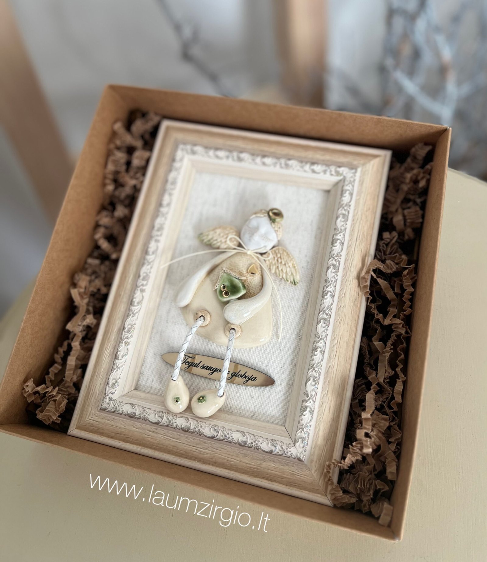 Autorinis Laumžirgio namų rankų darbo keraminis angelas rėmelyje.