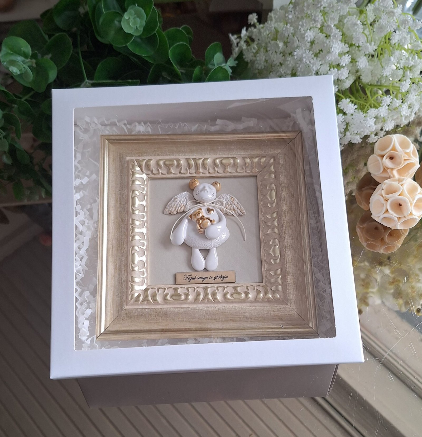Autorinis Laumžirgio namų rankų darbo keraminis angelas rėmelyje.