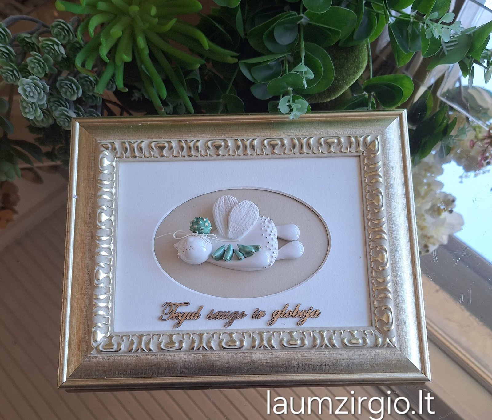 Autorinis Laumžirgio namų rankų darbo keraminis angelas rėmelyje.
