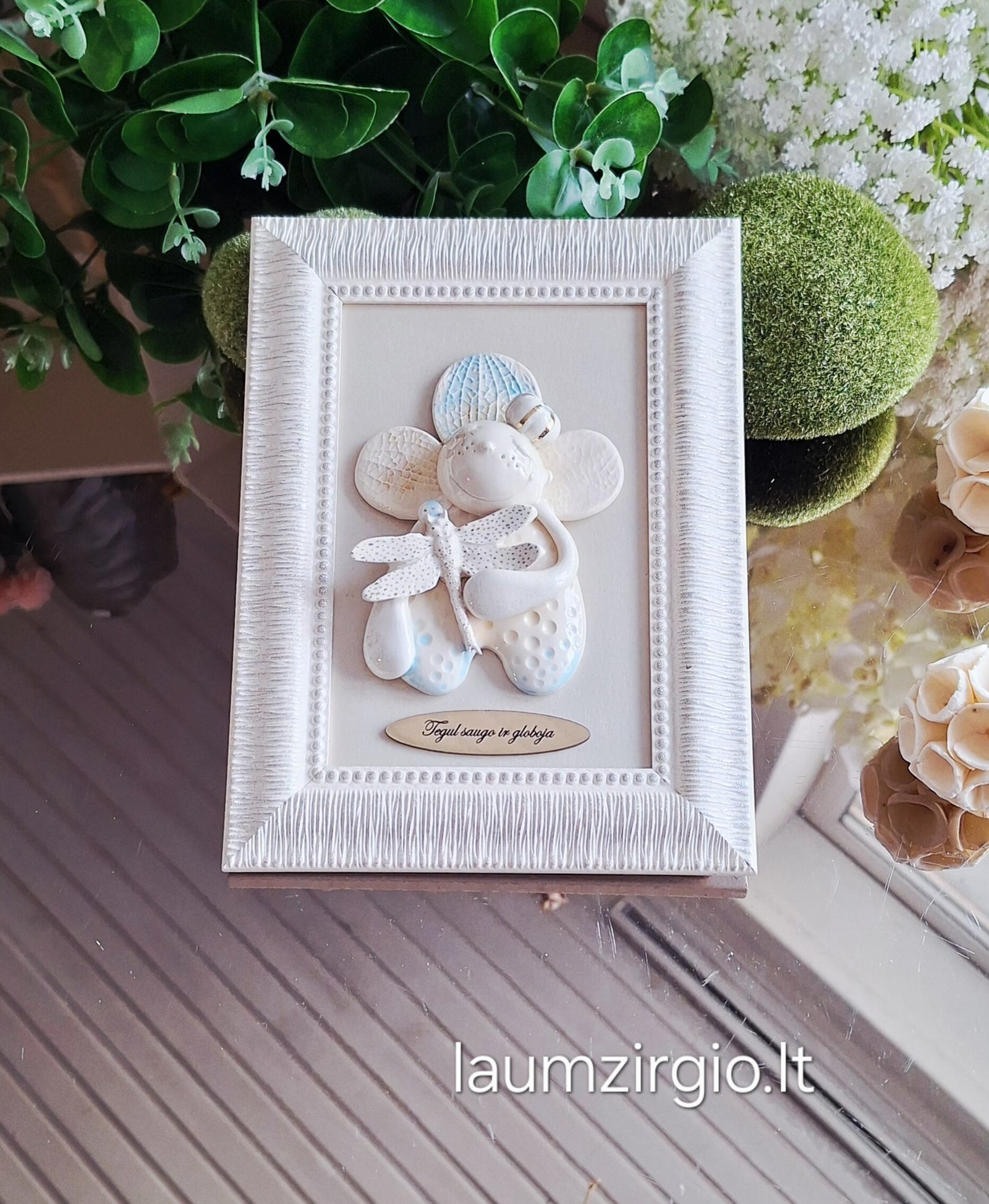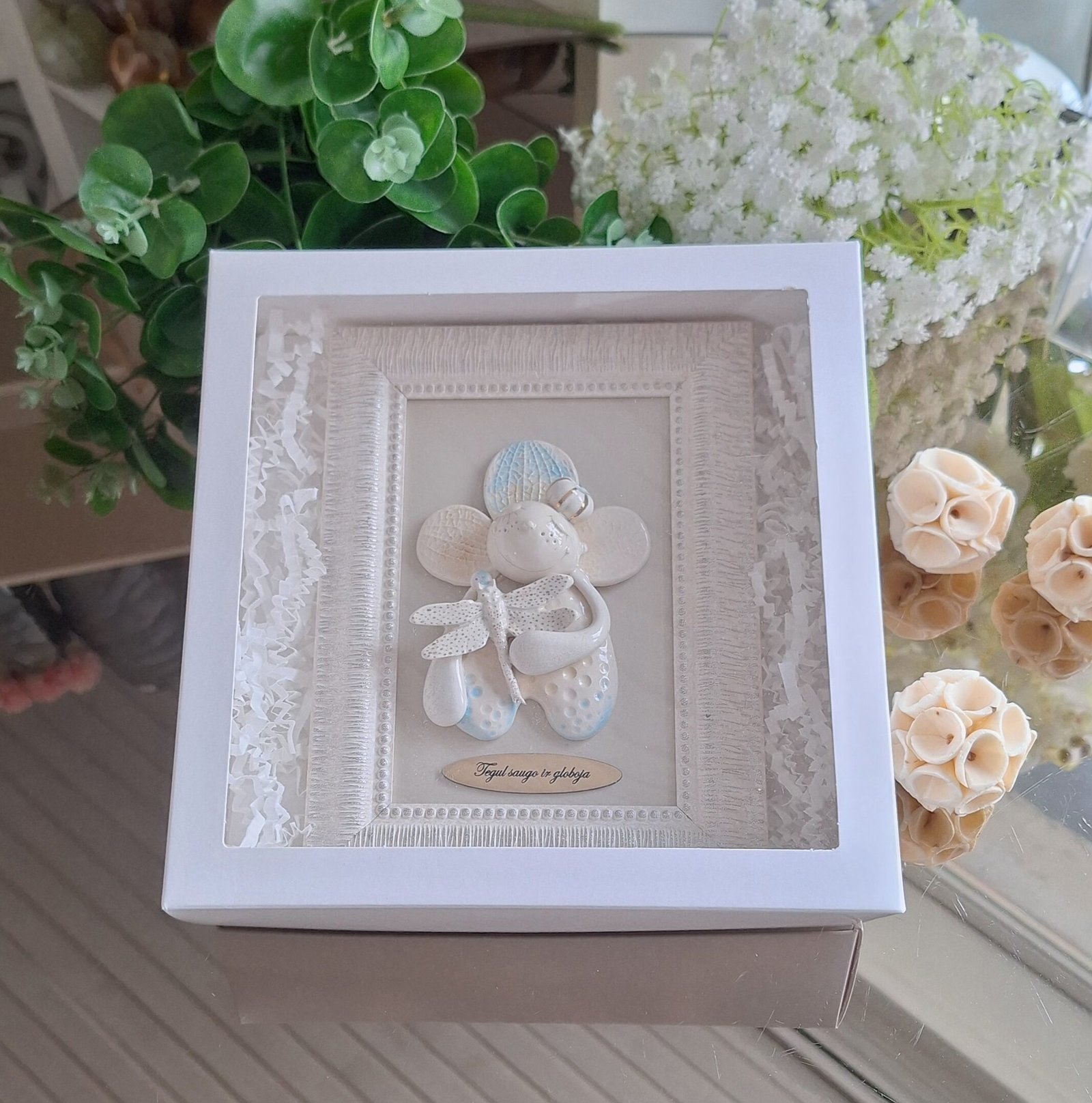 Unikalus, autorinis keraminis angelas rėmelyje – subtili, estetiška ir prasminga interjero detalė ar dovana ypatingai progai. Kiekvienas angelas yra rankų darbo kūrinys, sukurtas iš balto molio, glazūruotas, įkomponuotas elegantiškame rėmelyje.