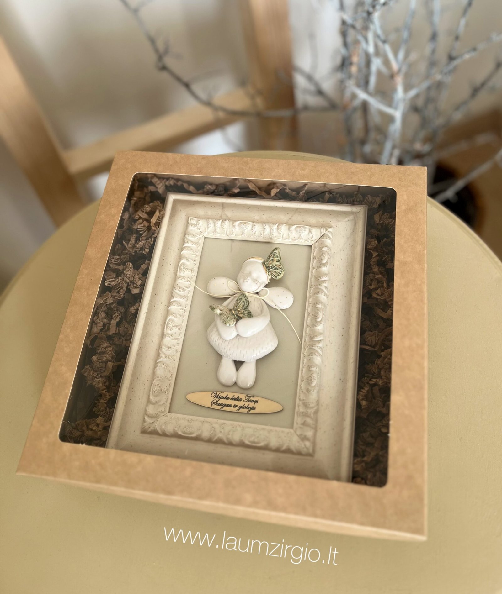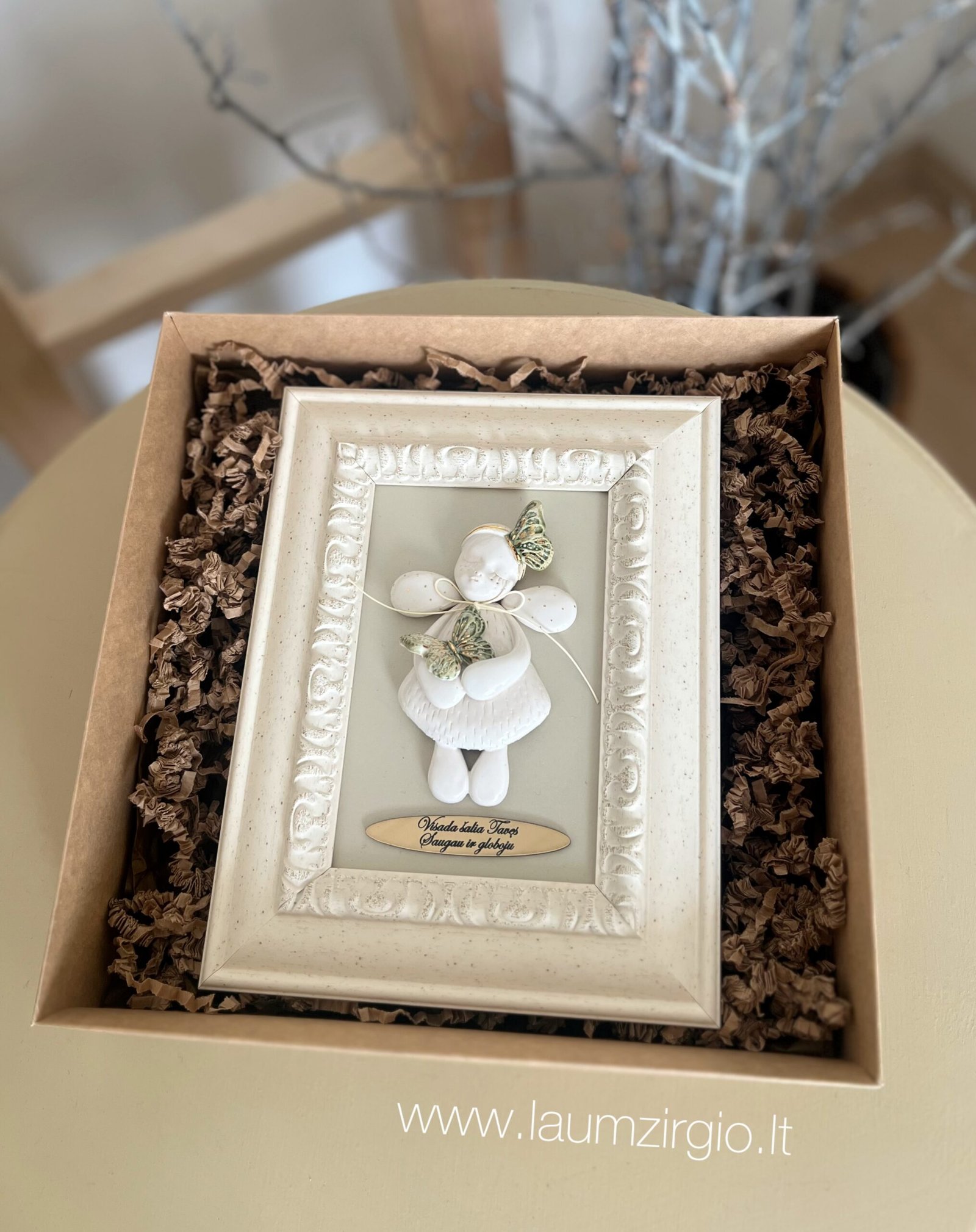 Autorinis Laumžirgio namų rankų darbo keraminis angelas rėmelyje.