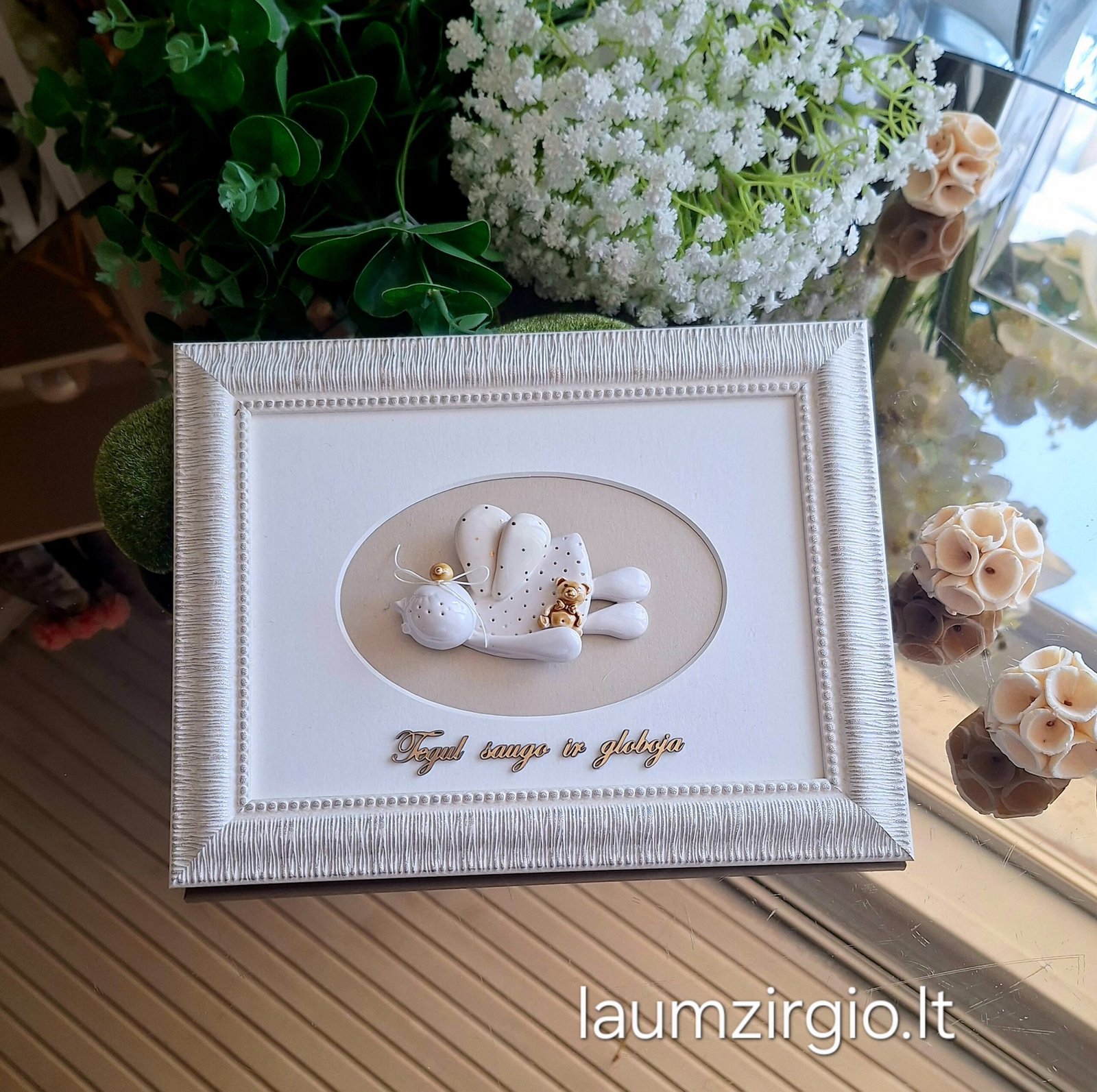 Autorinis Laumžirgio namų rankų darbo keraminis angelas rėmelyje.