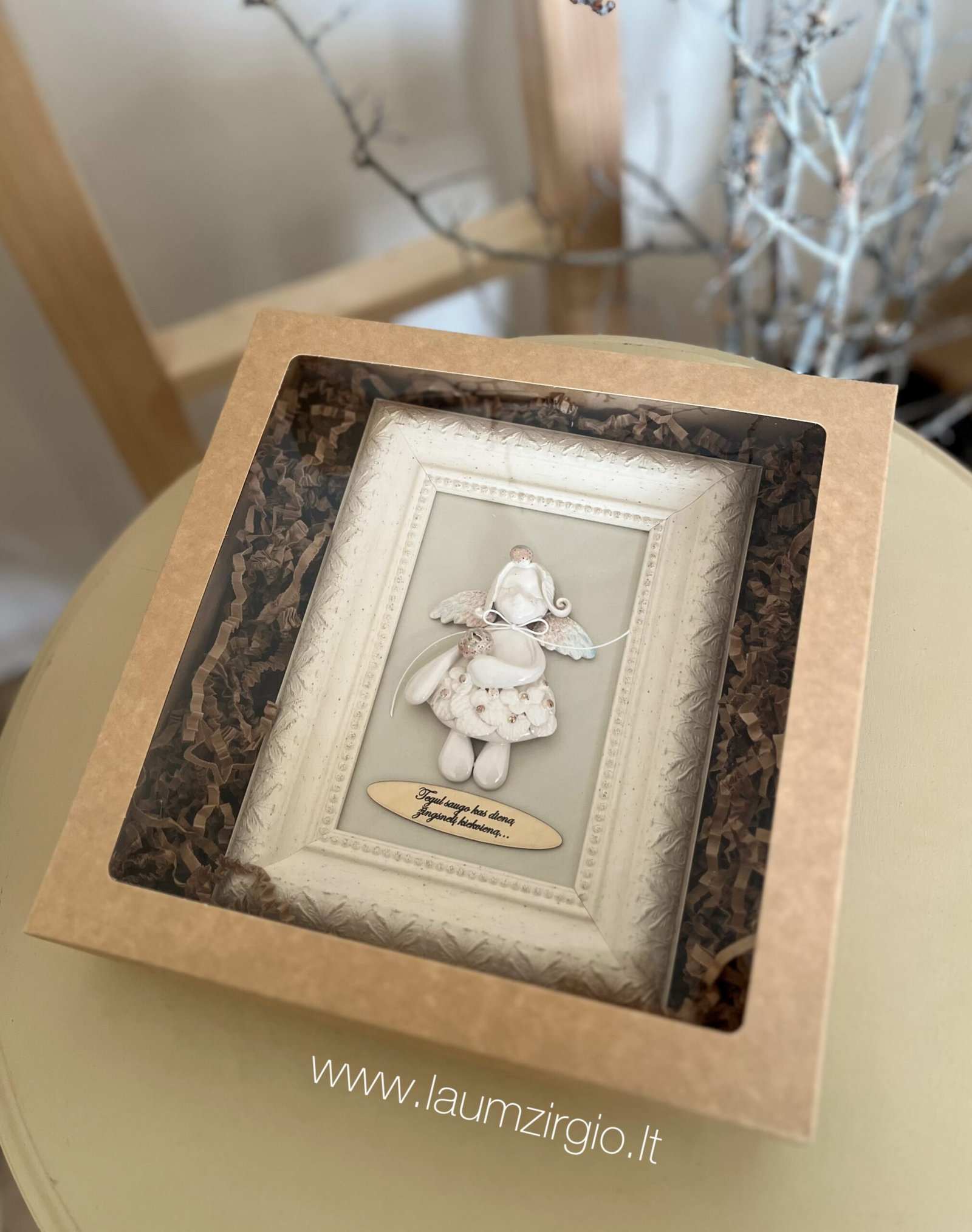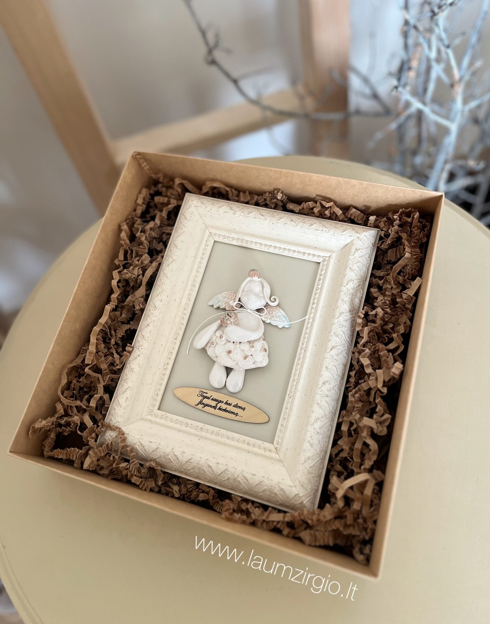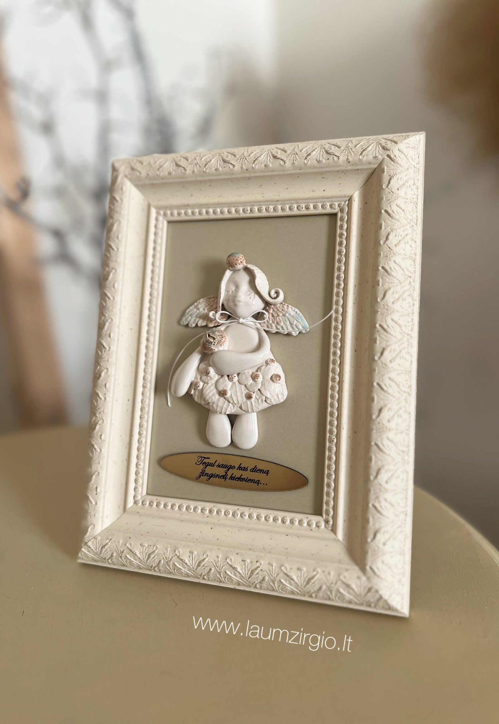 Autorinis Laumžirgio namų rankų darbo keraminis angelas rėmelyje.