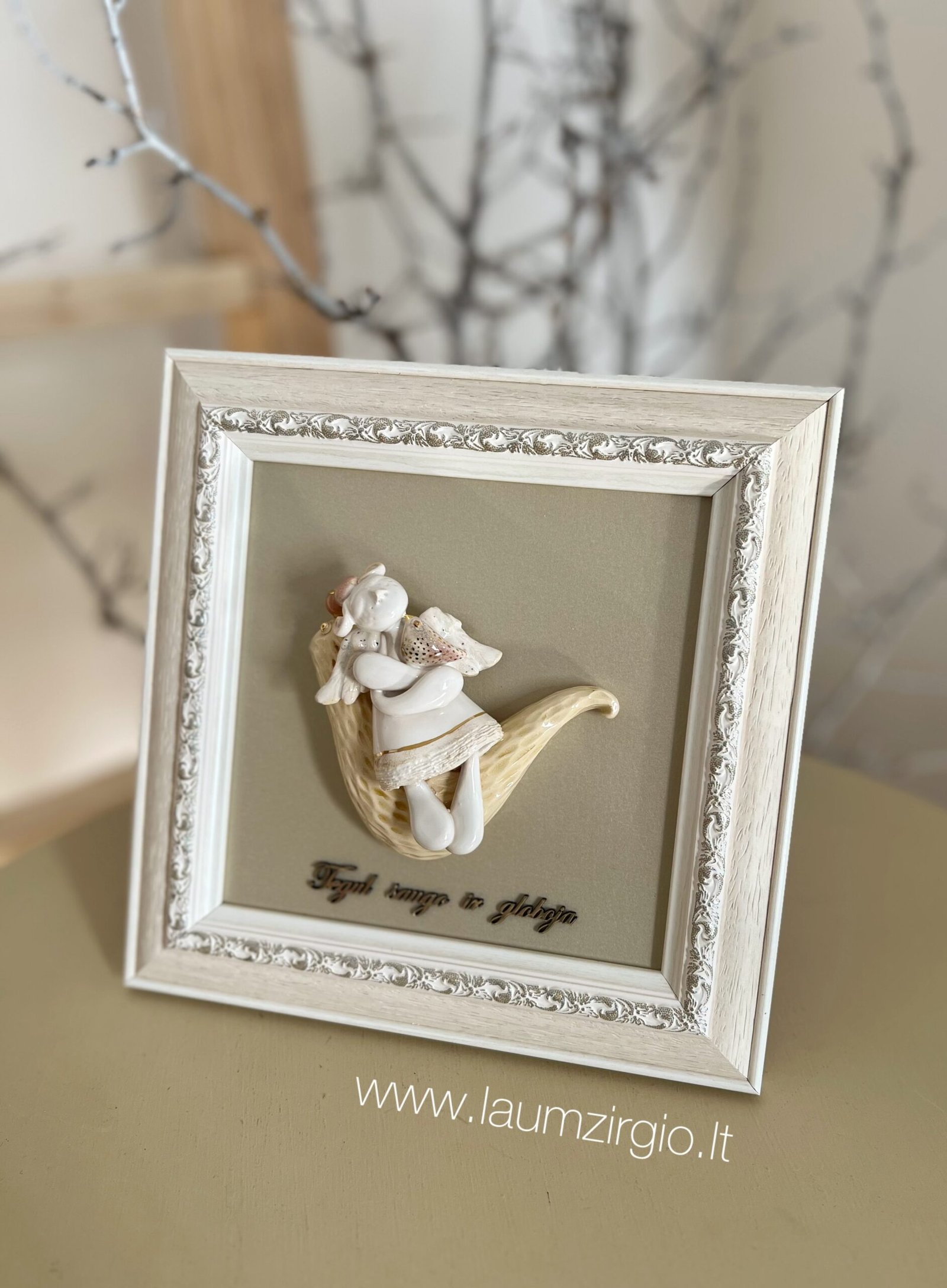 Autorinis Laumžirgio namų rankų darbo keraminis angelas rėmelyje.