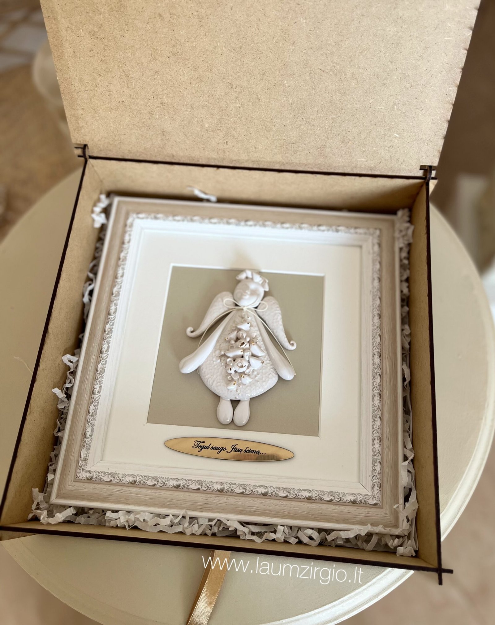 Autorinė Laumžirgio namų rankų darbo keraminis angelas rėmelyje.