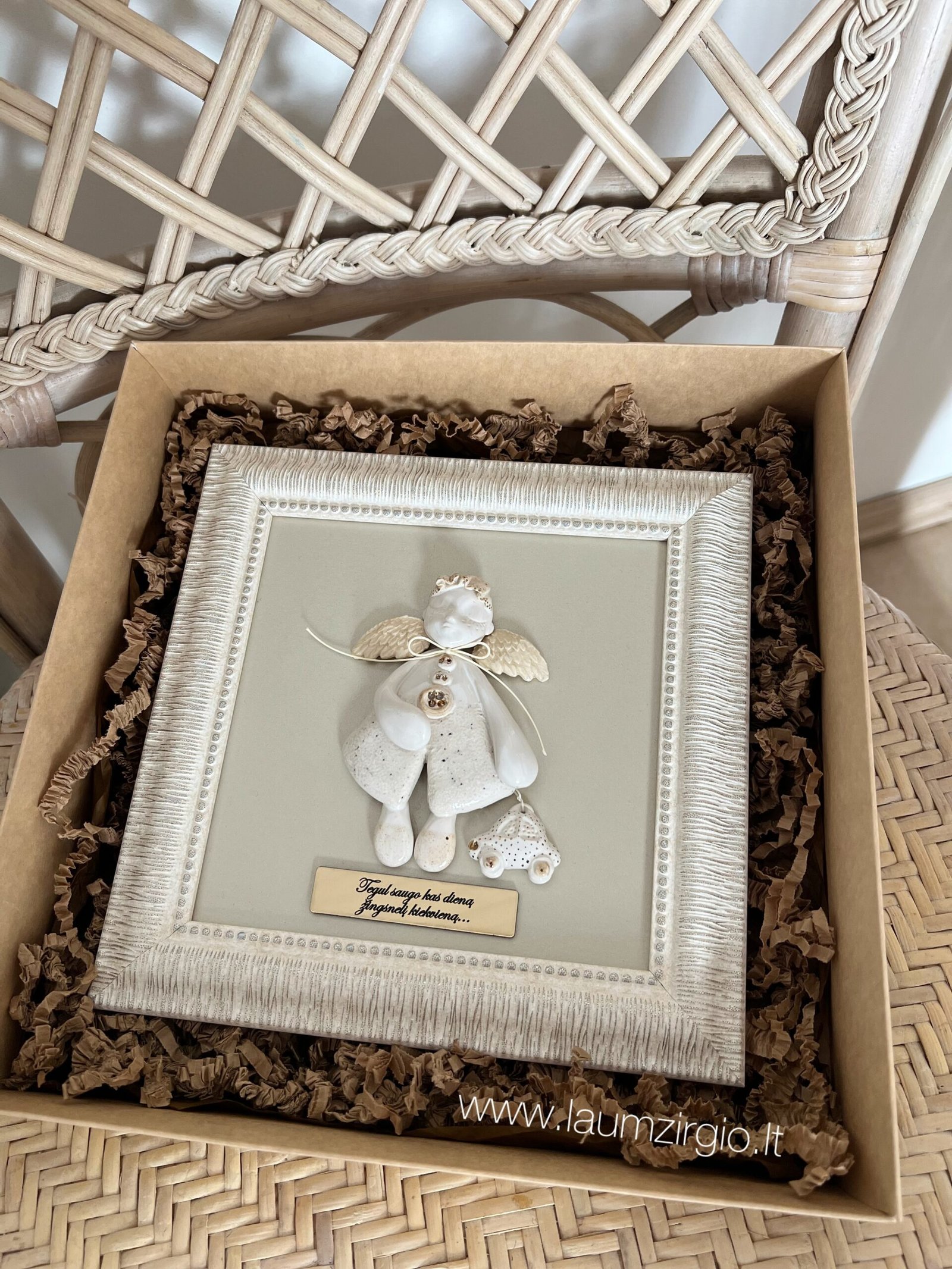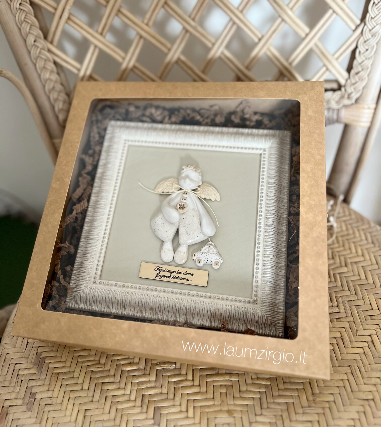 - Rėmelis su stiklu (A4 formato, 21 x 29,7 cm), rėmelis gali būti pastatomas ar kabinamas ant sienos. Rėmelio spalva: balta su dekoru.