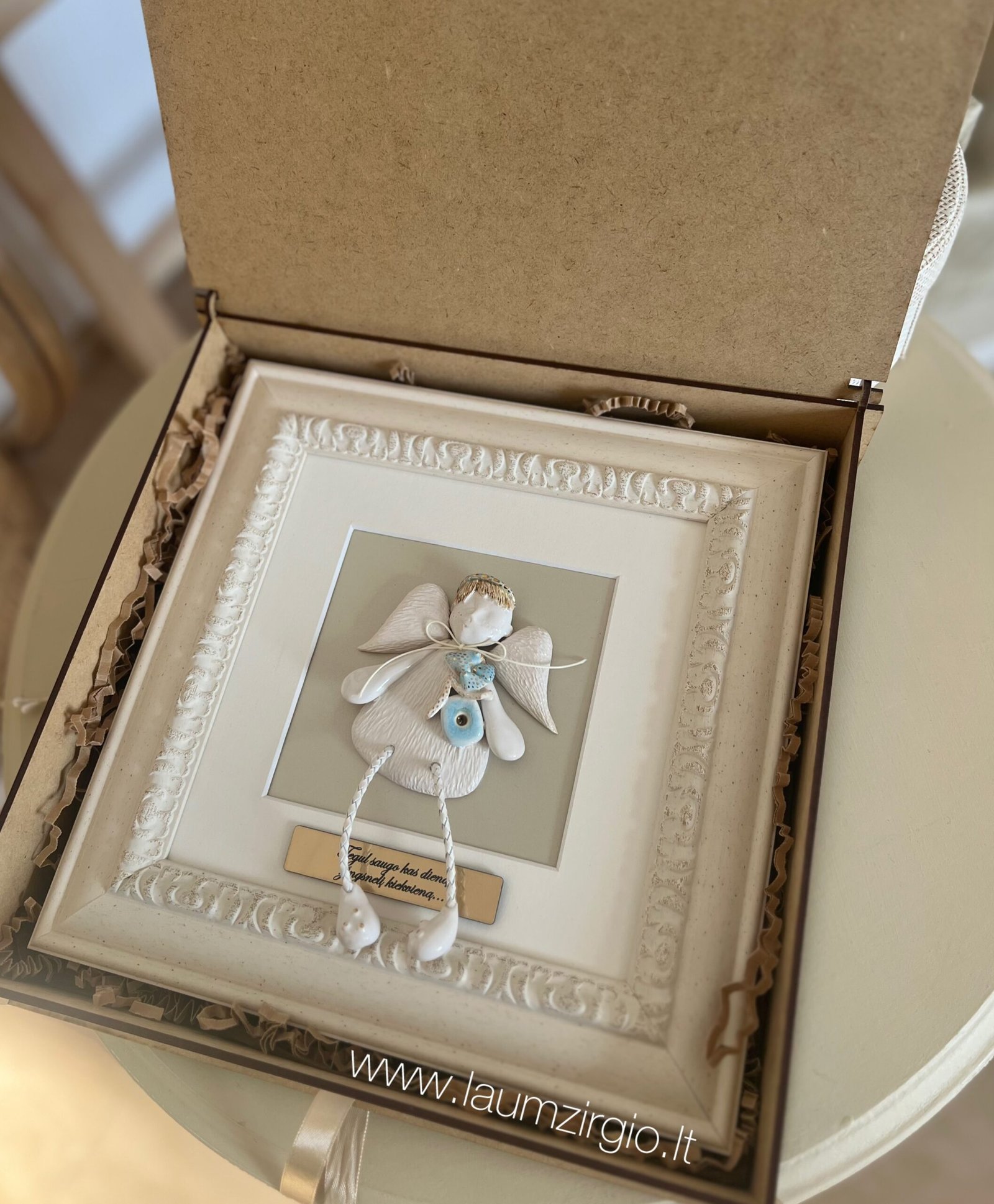 Autorinis Laumžirgio namų rankų darbo keraminis angelas rėmelyje.