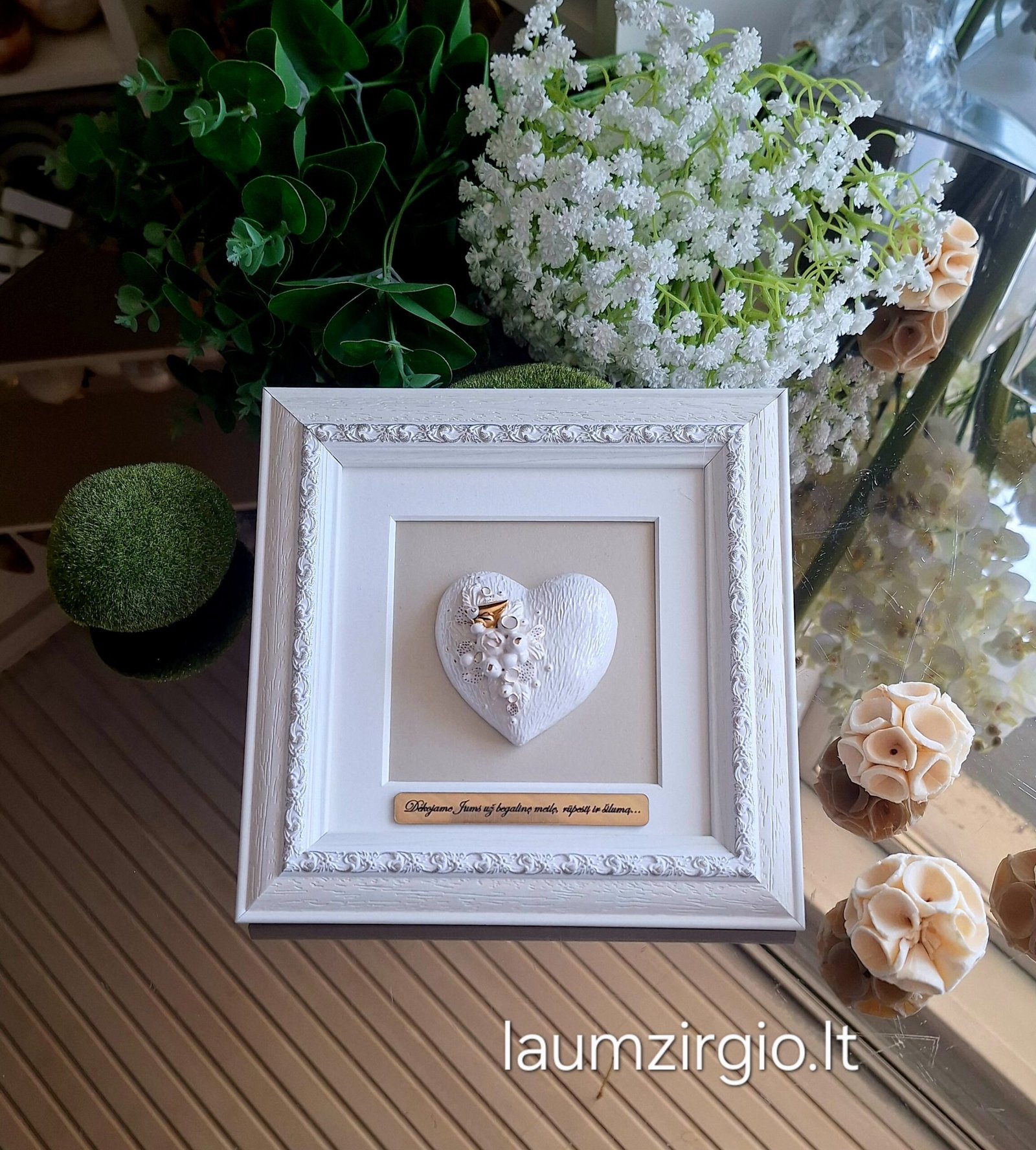 Autorinė Laumžirgio namų rankų darbo keraminė širdis su angeliuku rėmelyje.
