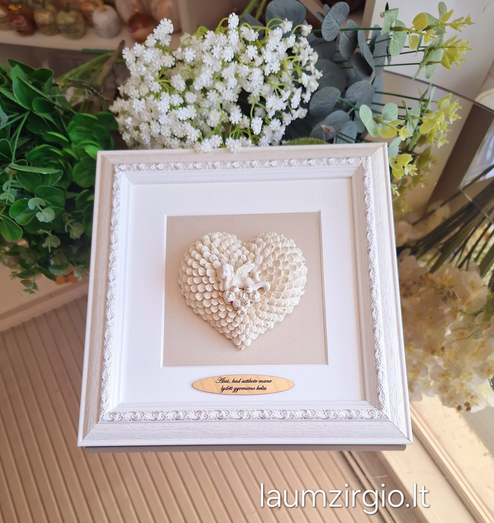 Autorinė Laumžirgio namų rankų darbo keraminė širdis su angeliuku rėmelyje.