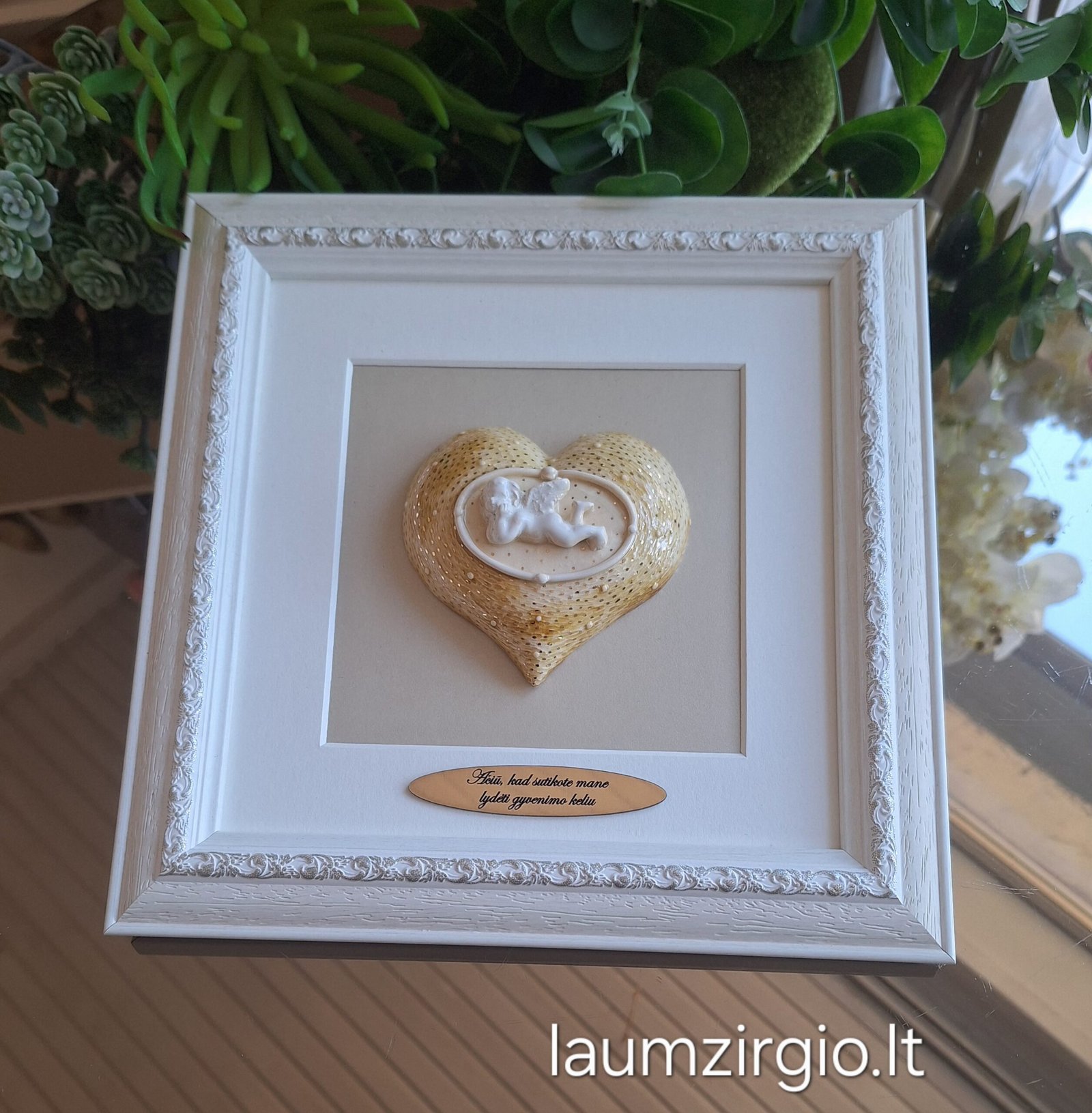 Autorinė Laumžirgio namų rankų darbo keraminė širdis su angeliuku rėmelyje.