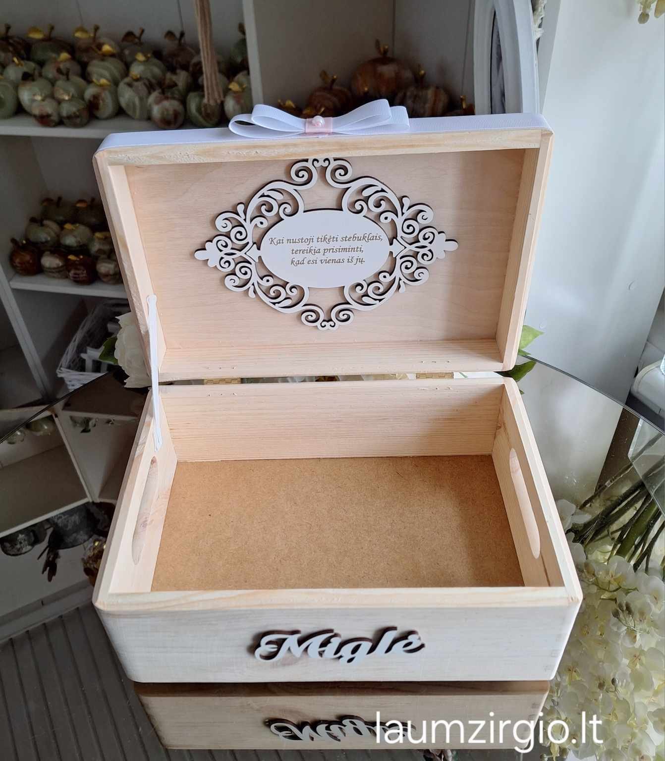 Kokybiška, medinė krikštadėžė, graviruota lazeriu, dekoruota karoliukais ir kaspinėliu. Taip pat su išpjauta kortele ant kurios graviruojamas vaiko vardas. Ši stilinga, minimalistinė krikštadėžė tikras vaikučio krikštynų ir vaikystės prisiminimų lobynas. Iki pilnametystės joje galėsite saugoti krikšto žvakę, krikšto drabužėlius ir skraistę, atvirukus, palinkėjimų korteles, juvelyrinius dirbinius ir kitus krikštynų, ar pirmos komunijos suvenyrus. Dydis: 30 cm ilgis, 20 cm plotis, 13,5 cm aukštis.