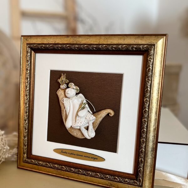 Autorinis Laumžirgio namų rankų darbo keraminis angelas rėmelyje.